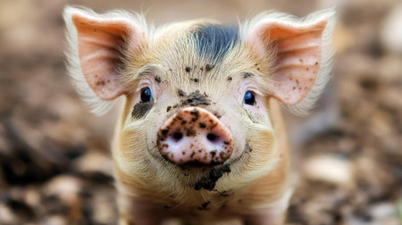 Close-up of a piglet's face with mud spots, looking directly into the camera with playful eyes.