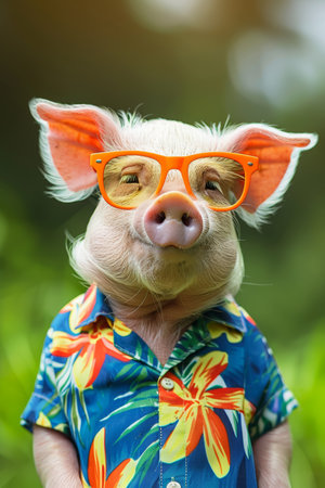 Stylish pig in trendy orange sunglasses and vibrant hawaiian shirt, a fashionable swine outfit