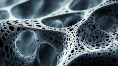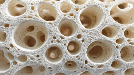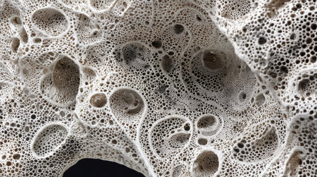 The close up view reveals complex patterns and shapes of a porous material featuring numerous holes and voids highlighting the intricate structure at a microscopic level.