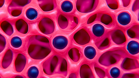 This image showcases a vibrant cellular network with interconnected pink structures and black nodes. The background is a solid color, creating a dynamic and engaging visual atmosphere.