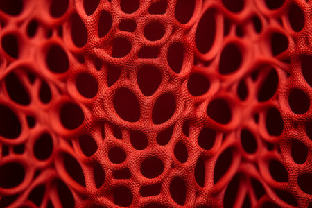 intricate structure of this showcases network of white, porous material against vibrant red background, evoking sense of organic beauty and complexity.