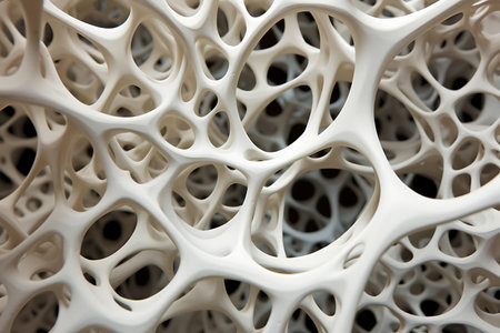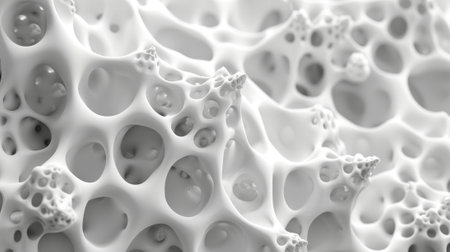 An artistic photograph suitable for topics related to modern art, design innovation, or architectural inspiration | This image offers a mesmerizing look at a modern, abstract design that exudes organic fluidity through interconnected shapes and soft color tones. The sinuous lines and curves create an almost skeletal structure, akin to a close-up of cellular forms or a flowing organic network. The palette of whites and creams set against deep shadows provides a graceful contrast that highlights the three-dimensionality of the piece, engaging the viewer's eye through its labyrinth of rounded openings and bridges. The soft, diffused lighting accentuates the gentle gradients and subtle intricacies, turning the piece into a visual paradox of complex simplicity. The design invites interpretations linked to natural patterns, suggesting a bridge between art, biology, and the mathematics of naturally occurring forms | This photograph is optimal for creative projects that require an abstract element with a sense of depth and organic connectivity. It can be used as a thought-provoking piece in art galleries, a background for digital or print design spaces, or as a complementary image in discussions about the intersection of nature and geometry. Additionally, it is well-suited as part of an aesthetic mood board for interior designers targeting minimalistic yet dynamic spaces or as a bold statement in architectural concept presentations | a detailed shot emphasizing the beauty and intricacy of abstract art, captured in a color scheme that promotes a calm yet engaging atmosphere, with ample space for overlaying text or additional graphic elements
