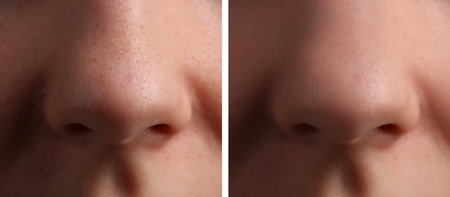 Skin problem with acne diseases, Close up woman face with whitehead pimples on nose, Scar and oily greasy face, Beauty concept.
