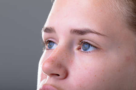 Close up face of young woman with blue eyes natural redhead watch at camera. Isolated over white background. Natural beauty and health