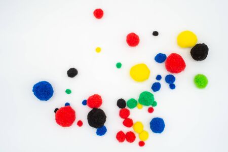 Bright multicolored different sized pom poms for craft making. Scattered on white background.