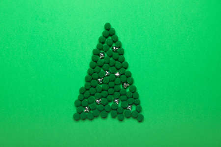 Creative Christmas tree made of decorations on color background