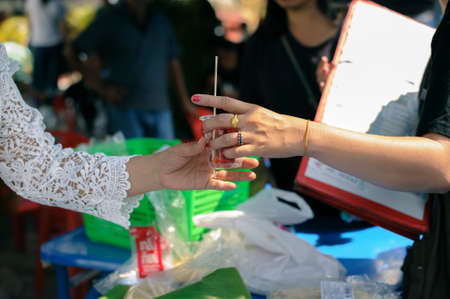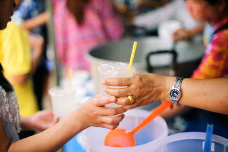 Hands of volunteers serves free food to the poor and needy in the city : The poor people bring a container to scoop food to eat and relieve hunger and bring home