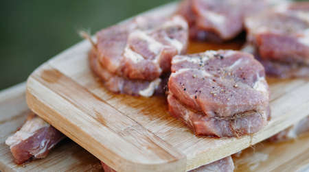 Raw meat on a wooden board, cut into pieces, seasoned and ready to grill outdoors on the background. Close-up, healthy food.