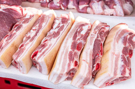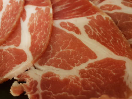 Top view of pork collar sliced as a background in the market for sale at Thailand, fresh meat for grill, Shabu