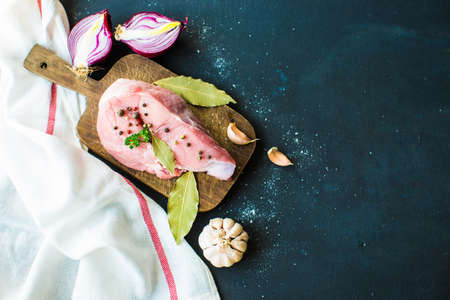 Organic raw meat with spices on rustic cutting board with towel on dark wooden background