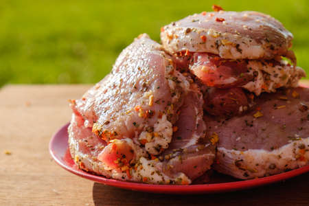Organic raw pork steak, marinated in dry spices, with sea salt. Cooking animal protein concept. On a stone background, copy space