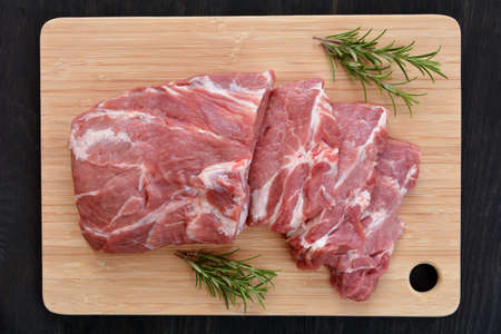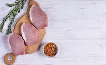 Raw pork steaks on the board. Top view. Fresh meat.