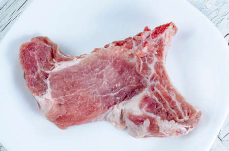 Raw pork chop steak on wooden background.