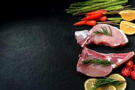 Top view, Close up of raw pork slice on black background, Space for text in template, fresh meat for grill