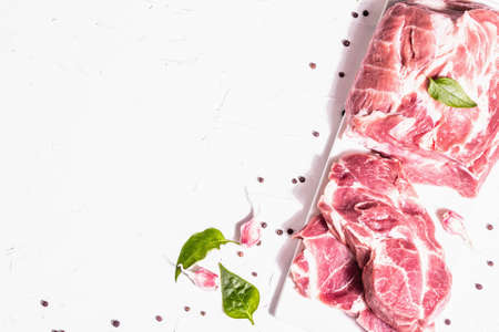 Raw pork meat, sliced cuts. Fresh meat, dry sumac, garlic and basil leaves. Healthy cooking food concept, trendy hard light, dark shadow. White putty background, top view