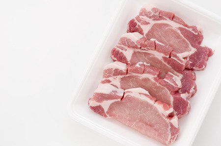 Raw pork meat in foam tray on white background