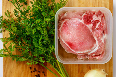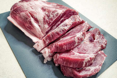 sliced for grilling or fried pork pieces on a cutting board. Cook at home.