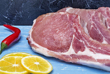 Pork chop steak. Raw meat on a wooden table.