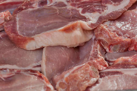 Large pieces of pork after butchering the carcass. Trade in fresh meat wholesale and retail. close-up. texture
