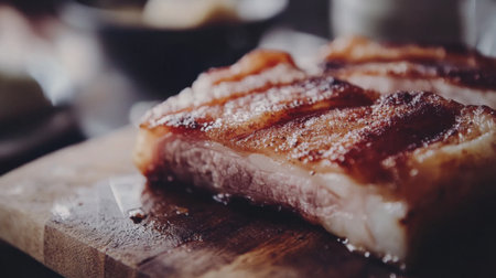 A mouthwatering view of a perfectly cooked pork belly slice on a wooden board, showcasing its crispy skin and juicy texture, ideal for food lovers.