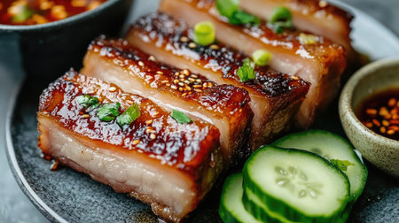 Indulge in beautifully caramelized pork belly slices served with fresh cucumber, herbs, and rich soy sauce, ideal for food enthusiasts and culinary explorations.