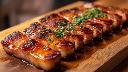Succulent glazed pork belly slices arranged on a wooden platter, garnished with vibrant chopped herbs. Ideal for showcasing delicious culinary creations.