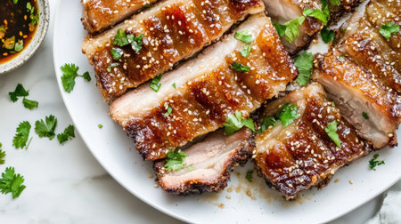 Enjoy a mouthwatering plate of crispy pork belly garnished with fresh herbs and sesame, perfect for any culinary enthusiast or special occasion.