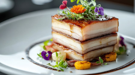 This stunning layered pork dish showcases an exceptional culinary presentation, with colorful edible flowers and fresh herbs enhancing the gourmet aesthetics.