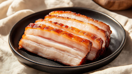 Crispy pork belly slices arranged beautifully on a black plate, showcasing their rich texture and golden-brown finish perfect for culinary creations.
