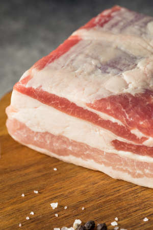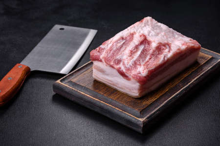 Side view of close up of view of pork belly on a wooden copping board. Meat concept.