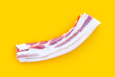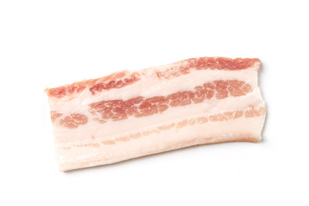 Raw bacon of meat isolated on white background. Streaky brisket slices, fresh thin sliced bacon. top view