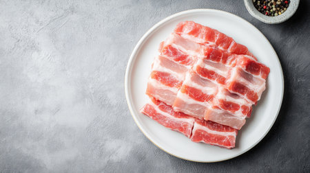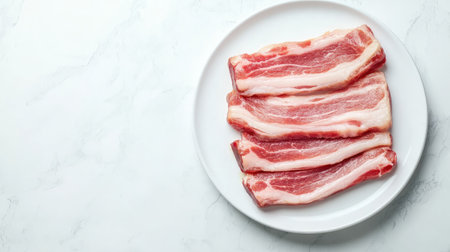 This image features fresh raw pork belly neatly arranged on a white plate. Ideal for culinary illustrations and food preparation concepts, it showcases the natural texture and color of the meat. Perfect for recipe ideas.
