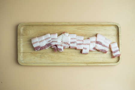 Fresh raw sliced streaky pork on the wood tray prepare for cooking deep-fried crispy pork belly