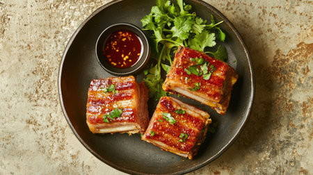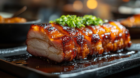 Savory glazed pork belly served on a black platter, garnished with fresh herbs and captured in warm light, perfect for food promotion and culinary art.