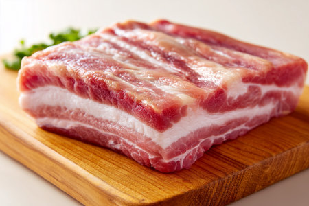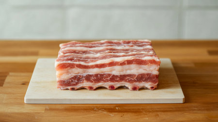 A close-up of raw pork belly with distinct layers of fat and meat, placed on a clean cutting board, ready for preparation, with a minimalist background