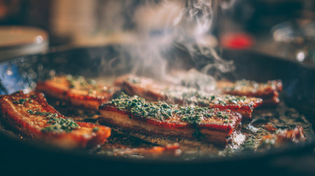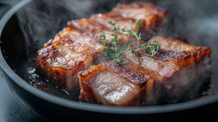 An artistic shot of pork belly slices sizzling in a pan, with golden-brown edges and aromatic herbs, highlighting the cooking process and delicious aromas.