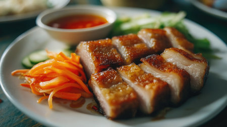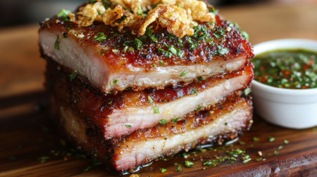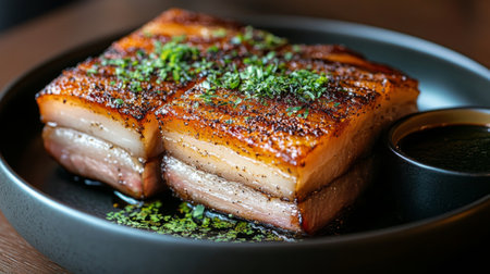 A beautiful close-up of roasted pork belly served on a plate, garnished with herbs and accompanied by a dipping sauce, highlighting its rich texture