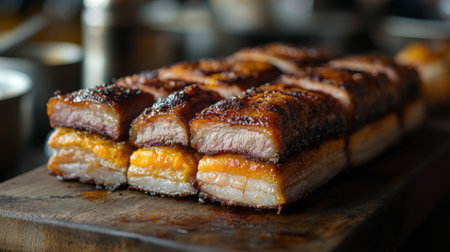A close-up of perfectly cooked crispy pork belly, with golden-brown skin and succulent layers of meat, beautifully arranged on a rustic wooden cutting board