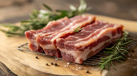Board with raw bacon with spices and rosemary on a black background, very tasty