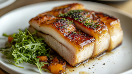 A perfectly cooked slice of crispy pork belly glazed with a rich sauce, garnished with fresh herbs on an elegant plate, ideal for gourmet dining.