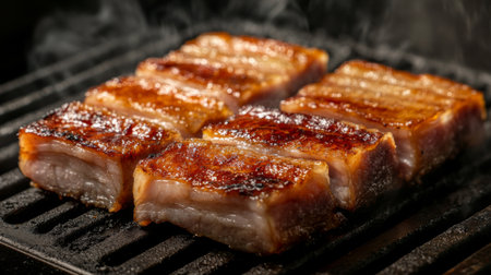 Close-up of grilled pork belly sizzling on a charcoal grill, exuding steam and rich flavors. Perfect for food lovers seeking savory cuisine inspiration.