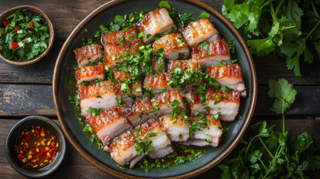 A beautifully arranged plate of crispy pork belly topped with fresh herbs and accompanied by a spicy chili sauce, perfect for any gourmet foodie or culinary enthusiast.