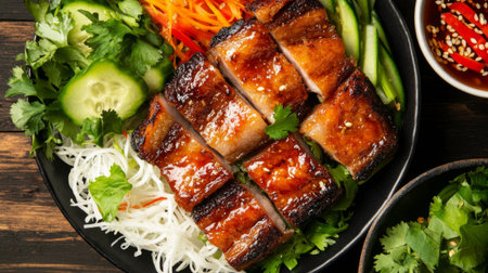 Indulge in beautifully caramelized pork belly slices served with fresh cucumber, herbs, and rich soy sauce, ideal for food enthusiasts and culinary explorations.