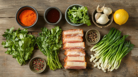 Colorful arrangement of fresh cooking ingredients on a rustic table. Includes herbs, spices, meat, and vegetables, perfect for culinary inspiration.