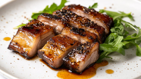Indulge in this exquisite grilled pork belly dish presented on fresh greens. The rich flavor, crispy texture, and savory sauce create a mouthwatering experience.