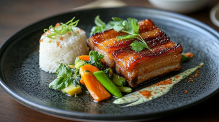 A beautifully plated dish featuring glazed pork belly, served alongside vibrant vegetables and fluffy rice, creating a delightful dining experience.