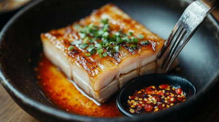 A beautifully presented dish of glazed pork belly topped with green onions. Served with a side of spicy dipping sauce, this culinary delight is visually appealing and perfect for food photography.