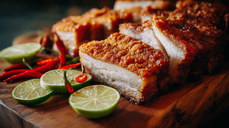 Indulge in the rich flavors of crispy pork belly complemented by fresh lime and spicy chili. Perfect for food photography and culinary inspiration showcasing delicious cuisine.