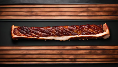 A mouthwatering view of a perfectly cooked pork belly slice on a wooden board, showcasing its crispy skin and juicy texture, ideal for food lovers.
