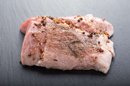 Raw pork meat seasoned for cooking on wooden plate